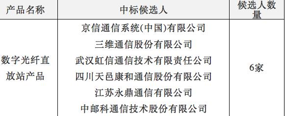 ICCSZ訊 日前,中國(guó)電信發(fā)布了2017年數(shù)字光纖直放站產(chǎn)品集采項(xiàng)目中標(biāo)人,共有六家企業(yè)中標(biāo)。分別是: