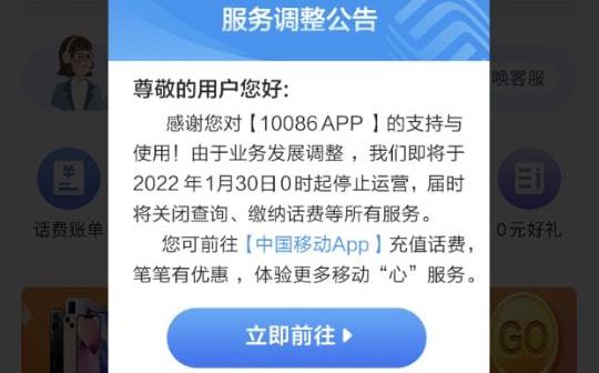 ICC訊 中國(guó)移動(dòng)旗下 10086 App 近日在客戶端內(nèi)發(fā)布公告稱:由于業(yè)務(wù)發(fā)展調(diào)整,10086 App 將于 2022 年 1 月 30 日 0 時(shí)起停止運(yùn)營(yíng),屆時(shí)將關(guān)閉查詢、繳納話費(fèi)等所有服務(wù),同時(shí)邀請(qǐng)用戶使用中國(guó)移動(dòng) App。