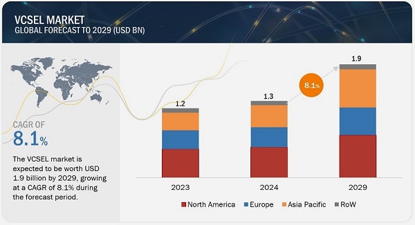 ICC訊(編譯:Nina)根據(jù)MarketsandMarkets?的一份新報告,全球VCSEL市場將從2024年的13億美元增長到2029年的19億美元,在預測期間,該市場的復合年增長率(CAGR)為8.1%。
