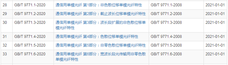其中光通信行業(yè)涉及,《通信用單模光纖 第1部分:非色散位移單模光纖特性》、《通信用單模光纖 第2部分:截止波長(zhǎng)位移單模光纖特性》、《通信用單模光纖 第3部分:波長(zhǎng)段擴(kuò)展的非色散位移單模光纖特性》、《通信用單模光纖 第4部分:色散位移單模光纖特性》、《通信用單模光纖 第5部分:非零色散位移單模光纖特性》、《通信用單模光纖 第6部分:寬波長(zhǎng)段光傳輸用非零色散單模光纖特性》。