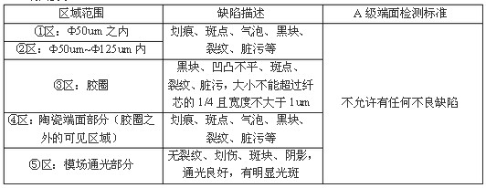 三、端面標(biāo)準(zhǔn):根據(jù)附錄1《光纖連接器端面檢驗規(guī)范》檢驗。