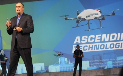Above: Brian Krzanich, CEO of Intel, demos the Firefly drones from Ascending Technologies at CES 2015.Image Credit: Dean Takahashi