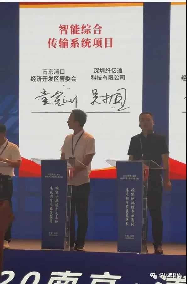 在項目簽約儀式上,南京浦口經(jīng)濟開發(fā)區(qū)管委會主任童金洲、深圳纖億通科技有限公司總經(jīng)理吳桐雙方代表簽署《智能綜合傳輸系統(tǒng)項目合作書》。