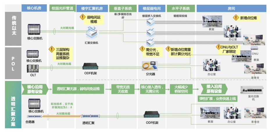 圖 透明匯聚方案與傳統(tǒng)以太和POL方案的對比