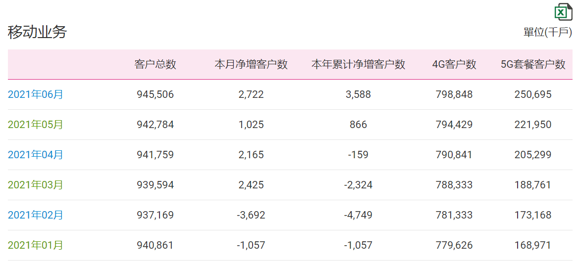 ICC訊 (編輯:Anton)7月20日,中國移動公布2021年6月份運營數(shù)據(jù),6月凈增5G套餐客戶數(shù)2874.5萬戶。截至2021年6月末,5G套餐客戶數(shù)累達2.50695億戶。5G套餐客戶指訂購5G資費套餐的個人移動電話客戶,不包含未訂購5G套餐、僅共享5G套餐資源的客戶。 4G客戶數(shù)凈增441.9萬,6月4G客戶數(shù)累計7.98848億。