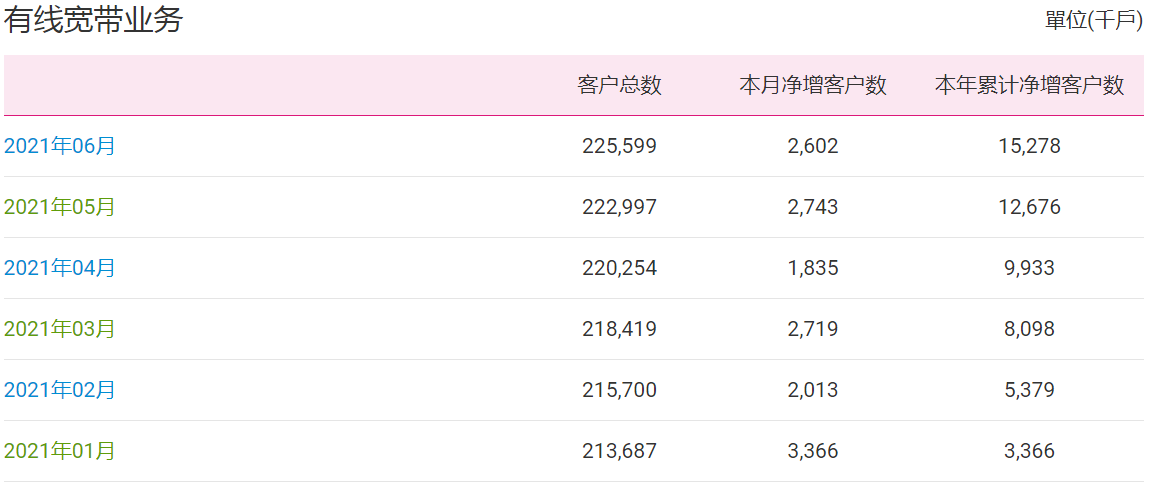 另外,6月有線寬帶業(yè)務凈增260.2萬戶,客戶總數(shù)累計2.25599億。
