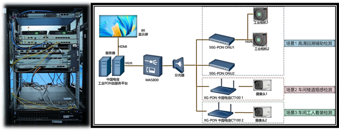 中國電信研究院在試點中應(yīng)用了集成算力和工業(yè)數(shù)采接口的新型自研工業(yè)PON邊緣設(shè)備,加載AI算法后接入50G-PON/XG-PON雙模端口,成功實現(xiàn)了車間樓道煙感檢測、車間工人著裝檢測等兩個智能應(yīng)用業(yè)務(wù),協(xié)助提升傳統(tǒng)企業(yè)生產(chǎn)的智慧化、數(shù)字化管理水平。