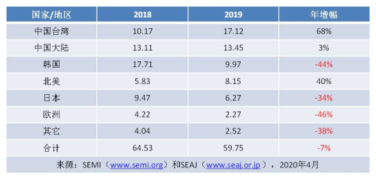其次是韓國,銷售額為99.7億美元,較2018年同期下降44%;盡管日本、歐洲以及其他地區(qū)的半導(dǎo)體設(shè)備市場同樣出現(xiàn)萎縮,但北美設(shè)備銷售在2019年則是猛增40%至81.5億美元,這也是該地區(qū)連續(xù)第三年出現(xiàn)增長。