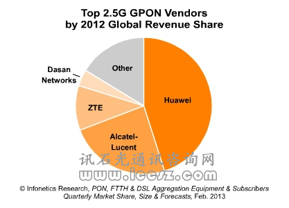 同時(shí),2012年2.5G GPON設(shè)備上升30%,主要是由于中國(guó)。中國(guó)電信和中國(guó)聯(lián)通在技術(shù)選擇上的戲劇性變動(dòng),將其FTTH部署投資從EPON轉(zhuǎn)到GPON。