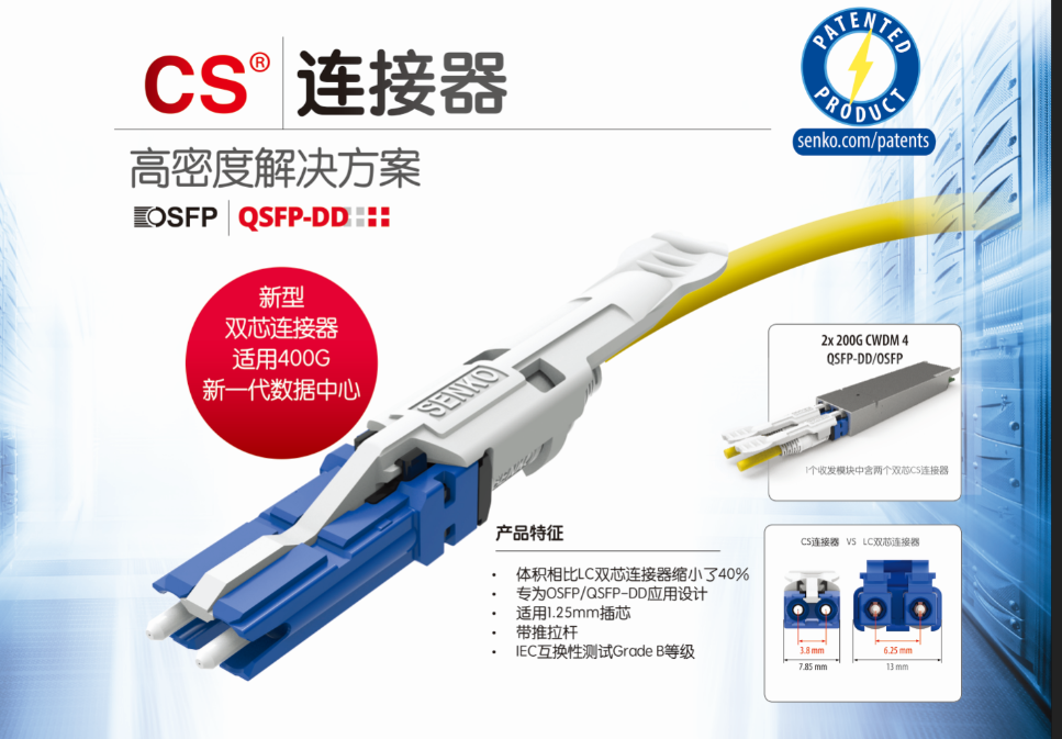 關于本次光博會上扇港展出的亮點產(chǎn)品——CS連接器,據(jù)聶經(jīng)理介紹,新型雙芯連接器,適用400G新一代數(shù)據(jù)中心。