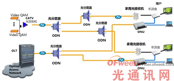 1550nm有線電視信號(hào)和1310nm、1490nm信號(hào)經(jīng)過合波器合波之后,在光纖中傳輸至用戶終端,用戶端ONU提供語(yǔ)音、寬帶和電視接口。采用三波合一的方式,能夠有效的節(jié)省主干光纜,同時(shí)單纖入戶,減少了施工成本,在運(yùn)營(yíng)管理上實(shí)現(xiàn)全網(wǎng)網(wǎng)管。三網(wǎng)合一的終端目前成本較高,ODN成本較低。