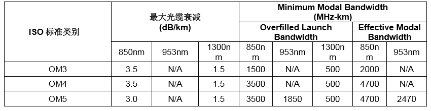 OM5寬帶多模光纜衰減從以前OM3, OM4光纜的3.5 dB/km降低到3.0 dB/km,另外增加了953nm波長上的帶寬要求。