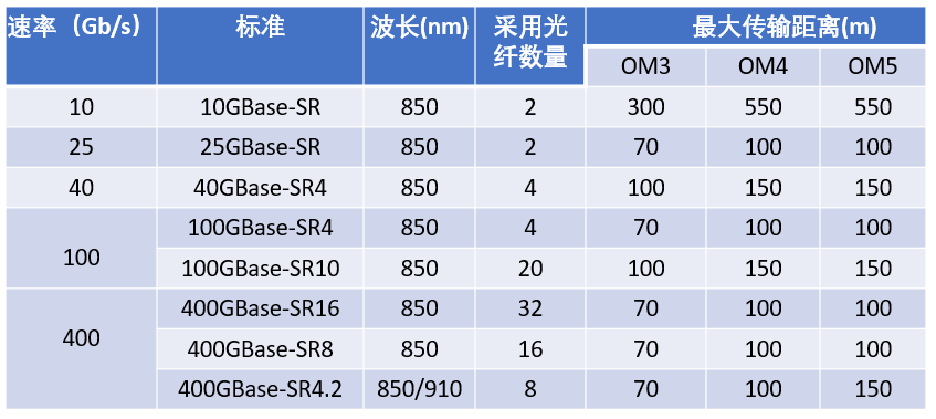 同時支持未來的400G以太網(wǎng),對于更高速的400G以太網(wǎng)應(yīng)用比如400GBase-SR4.2(4對光纖2個波長,每個通道采用50G PAM4)或者400G Base-SR4.4((4對光纖4個波長,每個通道采用25GNRZ),OM5光纖更具有傳輸距離的優(yōu)勢。