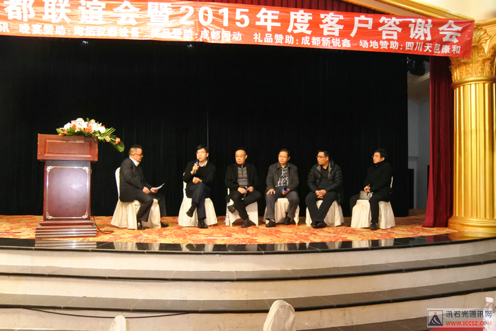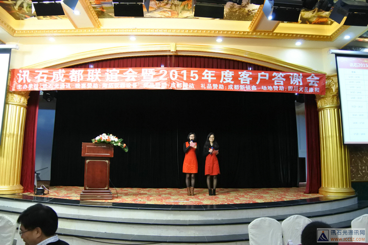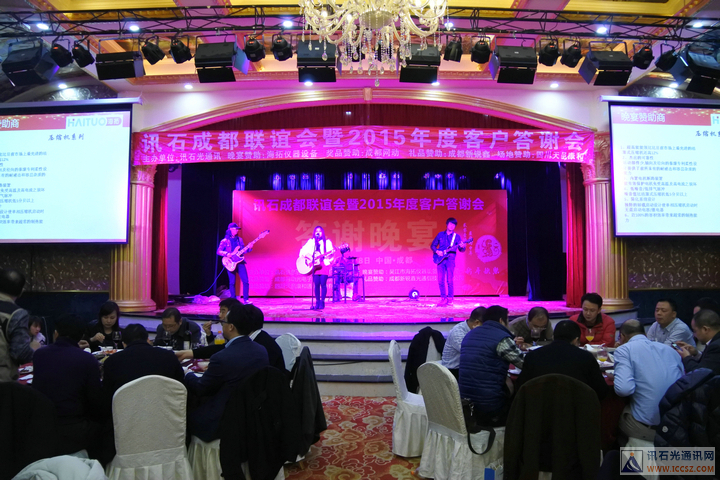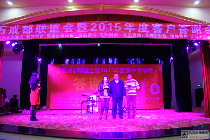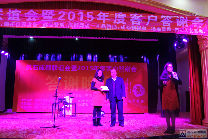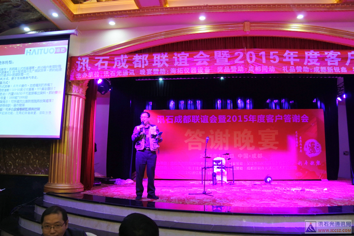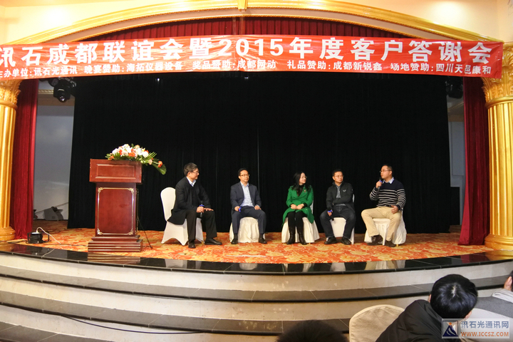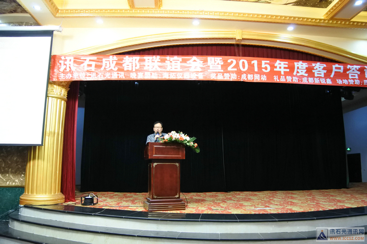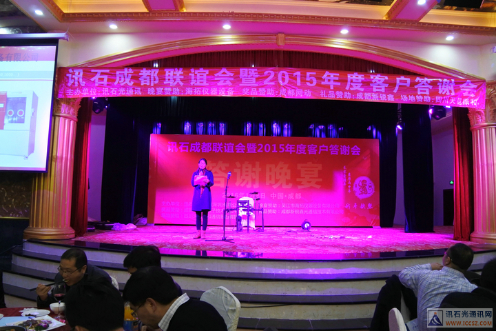 ICCSZ訊(編輯:Debi)桃未芳菲杏未紅,寒冬相聚話光通。2016年1月8日下午,由訊石主辦的“訊石成都聯(lián)誼會暨2015年度客戶答謝會”在成都天邑國際酒店圓滿舉辦,衷心感謝百忙之中遠道而來以及錦城本地的九十余家企業(yè)的200余位嘉賓的熱情出席,也非常感謝海拓儀器設(shè)備有限公司(TCT溫循箱)、成都網(wǎng)動光電子技術(shù)股份有限公司、成都新銳鑫光通信技術(shù)有限公司、四川天邑康和通信股份有限公司對本次會議的大力支持!會議在三大精彩主題演講與兩大意猶未盡的話題討論中穿插有致進行,尤其是頒發(fā)“訊石2015年度會員英雄”獎的環(huán)節(jié)把會議氣氛推向高潮,而討論環(huán)節(jié)的臺上嘉賓激勵爭論配合臺下嘉賓現(xiàn)場的踴躍提問,愈顯精彩異常。半天的會議結(jié)束后迎來輕松愉悅的晚宴活動,整個聯(lián)誼會的輕松有致的氣氛下圓滿舉辦。感謝大家的支持,也祝愿光通信行業(yè)在新的一年里欣欣向榮、奮發(fā)向上、更上一層樓!