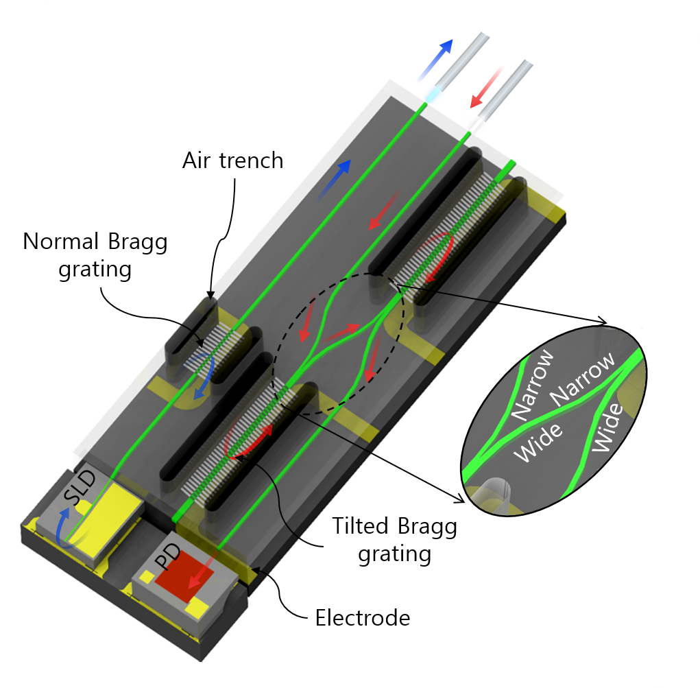 可調(diào)諧收發(fā)器原理圖。該收發(fā)器由基于聚合物波導(dǎo)布拉格反射光柵的可調(diào)諧激光器和可調(diào)諧濾波器組成??烧{(diào)諧激光器包括安裝在聚合物波導(dǎo)末端的SLD增益芯片,以及安裝在波導(dǎo)另一端的布拉格光柵;可調(diào)諧濾波器分為兩級:傾斜布拉格光柵和模式分選Y分支
