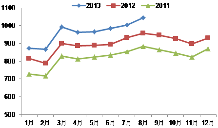 ICCSZ訊 8月份,我國電信主營業(yè)務(wù)收入完成1045.4億元,比上月小幅提升,同比增長8.9%。1-8月,電信主營業(yè)務(wù)收入累計(jì)完成7690.7億元,同比增長8.8%,與上月持平。從電信主營業(yè)務(wù)來看,我國通信業(yè)務(wù)在營收環(huán)節(jié)整體保持平穩(wěn)上升勢頭,運(yùn)營狀況良好。下圖為近三年我國電信主營業(yè)務(wù)走勢情況圖。