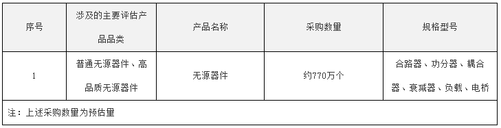該項目集采的產品品類為普通無源器件、高品質無源器件,涉及合路器、功分器、耦合器、衰減器、負載、電橋等多個規(guī)格型號,預估采購數量約770萬個。