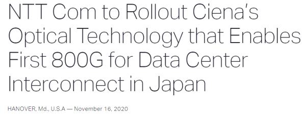 ICC訊(編譯:Nina)美國馬里蘭州漢諾威市,2020年11月16日--Ciena(紐交所:CIEN)今天宣布,NTT旗下ICT解決方案和國際通信業(yè)務(wù)部門NTT Communications Corporation(NTT Com)將為數(shù)據(jù)中心互連(DCI)部署單波800G線速解決方案。為了適應(yīng)5G、游戲和云服務(wù)的快速增長,NTT Com將升級其DCI網(wǎng)絡(luò),使其更具可編程性、靈活性和大容量。