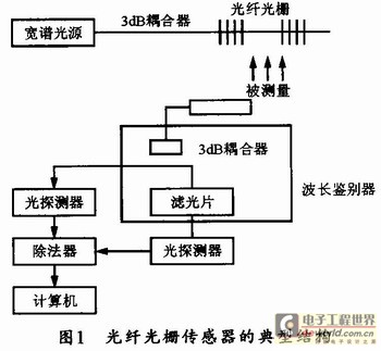 在圖1所示的光纖光柵傳感器結(jié)構(gòu)中,光源為寬譜光源且有足夠大的功率,以保證光柵反射信號良好的信噪比。一般選用側(cè)面發(fā)光二極管ELED的原因是其耦合進(jìn)單模光纖的光功率至少為50~100 μW。而當(dāng)被測溫度或壓力加在光纖光柵上時。由光纖光柵反射回的光信號可通過3 dB光纖定向耦合器送到波長鑒別器或波長分析器,然后通過光探測器進(jìn)行光電轉(zhuǎn)換,最后由計算機(jī)進(jìn)行分析、儲存,并按用戶規(guī)定的格式在計算機(jī)上顯示出被測量的大小。
