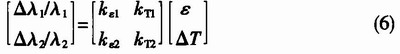 雙波長矩陣法是出現(xiàn)較早而且目前應(yīng)用較為廣泛的一種方案。其基本思想是通過一定方式在一個傳感頭中獲得兩個不同的布拉格波長,并通過檢測這兩個布拉格波長的位移來實現(xiàn)溫度不敏感測量或應(yīng)變及溫度的同時測量。如果λ1、λ2同時對兩被測量比較敏感。且波長漂移隨溫度和應(yīng)變的變化為線性,溫度和應(yīng)變變化獨立或只有微弱擾動,則由下式可得: