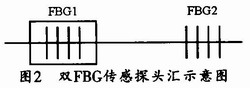 該方法是選用2個相同參數(shù)的FBG對同一測量點進(jìn)行測量,是用兩個相互相鄰且中心波長相同的FBG組成一個傳感探頭,其中FBGl的長度L1大于FBG2的長度L2,為了區(qū)分兩光柵的反射信號,圖2給出了該方法的雙FBG傳感探頭示意圖。