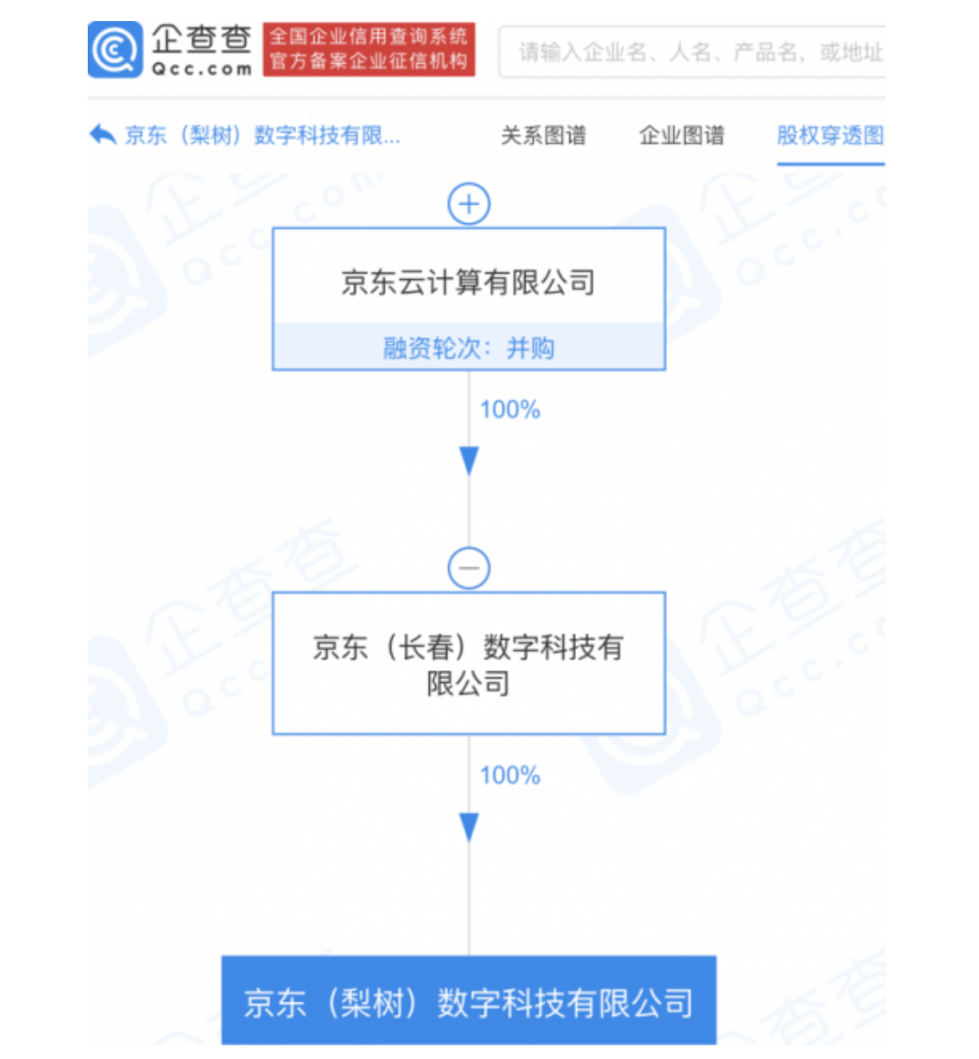 ICC訊 企查查APP顯示,3月19日,京東(梨樹)數(shù)字科技有限公司成立,法定代表人為王楠,注冊(cè)資本1000萬元人民幣,經(jīng)營范圍包含:5G通信技術(shù)服務(wù);云計(jì)算設(shè)備銷售;物聯(lián)網(wǎng)設(shè)備銷售;互聯(lián)網(wǎng)設(shè)備銷售等。企查查股權(quán)穿透顯示,該公司由京東云計(jì)算有限公司間接全資控股。