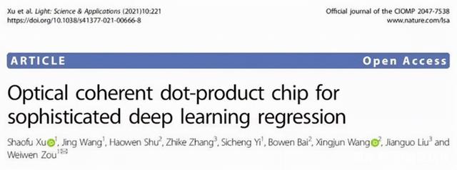 據(jù)了解,該研究成果已通過《optical coherent dot-product chip for sophisticated deep learning regression》(面向復(fù)雜深度學習回歸任務(wù)的光學相干點積核芯片)項目的認可,成功發(fā)表在光學領(lǐng)域權(quán)威期刊Light: Science & Applications。