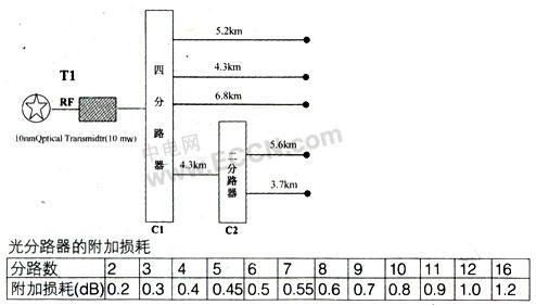 光分路器C1所需的輸入光功率9126+0.4=9.66(dBm)=9.25(mW),光發(fā)射機(jī)T1的輸出光功率=9.26+1=10.26(dBm)=10.62(mW),所以我們就可購(gòu)置光輸出功為10mW的1310nm光發(fā)射機(jī)。