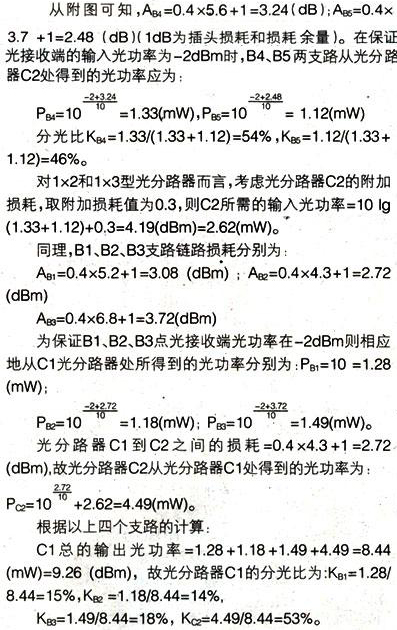 分光比。由千光接收端輸入光功率過(guò)低將導(dǎo)致輸出的C/N值過(guò)低,過(guò)強(qiáng)會(huì)導(dǎo)致非線(xiàn)性失真過(guò)大且CTB、CSO 指標(biāo)惡化,從而達(dá)不到網(wǎng)絡(luò)所需的指標(biāo)要求,在此光接收端輸入光功率我們?nèi)?2dBm作為設(shè)計(jì)值,計(jì)算中保留2位小數(shù)。