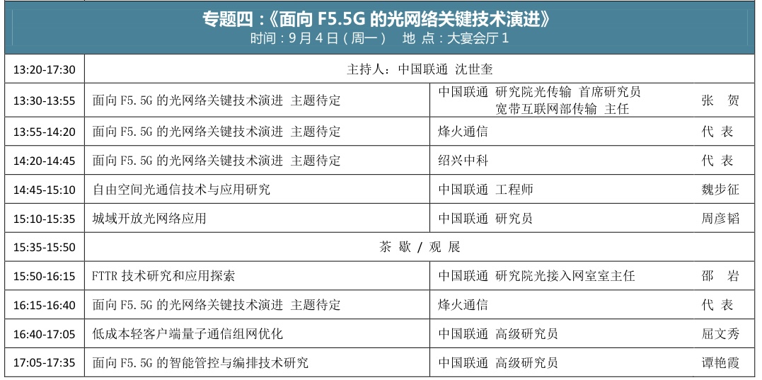 9月4日iFOC 2023,專題四《面向F5.5G的光網(wǎng)絡(luò)關(guān)鍵技術(shù)演進(jìn)》由中國聯(lián)通與訊石聯(lián)合主辦,中國聯(lián)通將帶來集團(tuán)公司在光領(lǐng)域關(guān)鍵技術(shù)的最新研究成果;該專題同時(shí)得到了知名設(shè)備商烽火通信、光模塊企業(yè)紹興中科加入,帶來精彩演講。