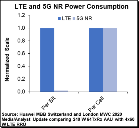 由于不乏媒體報(bào)道表明5G蜂窩站點(diǎn)將比4G蜂窩站點(diǎn)耗電多得多,因此在過(guò)去的一年中,設(shè)備供應(yīng)商通過(guò)其5G產(chǎn)品組合加大了工程和營(yíng)銷工作。華為曾多次討論5G NR和LTE之間每比特功耗的25倍至50倍(未來(lái)100倍)的優(yōu)勢(shì),同時(shí)承認(rèn)總體NR Cell的功耗可能會(huì)更高?,F(xiàn)在,部分由于信道、載波和符號(hào)關(guān)斷方面的進(jìn)步,華為表示將64TxRx AAU與4×60 W LTE RRU進(jìn)行比較時(shí),NR和LTE之間的總功率預(yù)算是相當(dāng)?shù)摹?