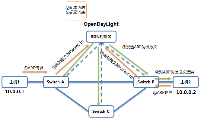 H1去pingH2,即10.0.0.1去ping10.0.0.2。因為沒有H2的MAC,此時需要做一次ARP解析。此時ARP請求(原本是廣播)被SwitchA通過Openflow形式單播上送給Controller(packet-in報文)