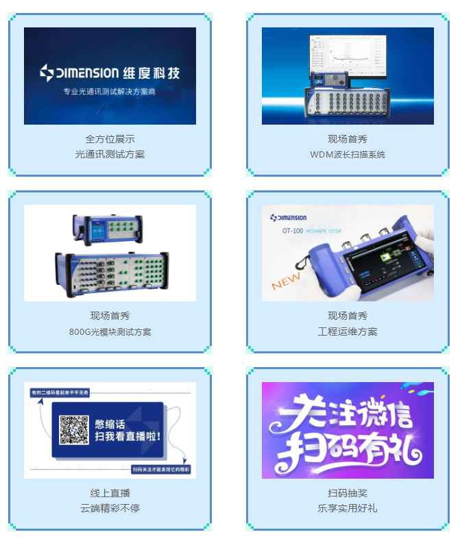ICC訊 2023年9月6-8日,CIOE深圳光博會將于深圳國際會展中心(寶安新館)隆重舉行。維度科技將攜多款最新產(chǎn)品及方案亮相,涵蓋光通訊測試多種方案,歡迎蒞臨體驗。