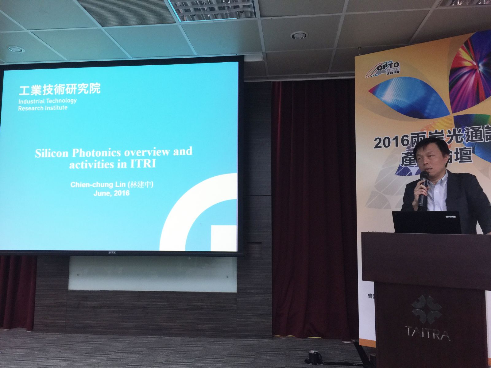 全球及中國大陸光通訊市場的報告結束,由臺灣工研院光電所的林建中博士為大家做關于《Silicon Photonics Research in ITRI》主題演講。