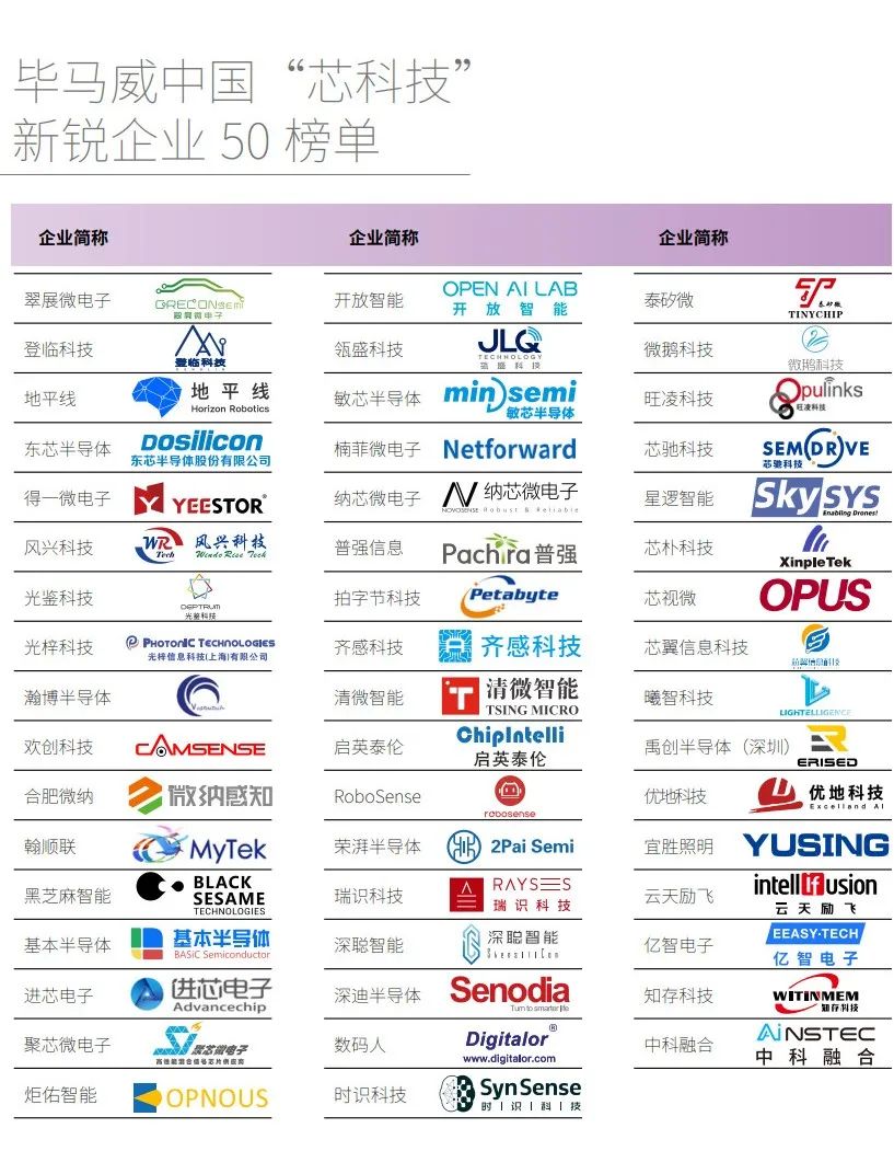 中國“芯科技”新銳企業(yè)50評選結(jié)果按照企業(yè)首字母順序排序,排名不分先后。