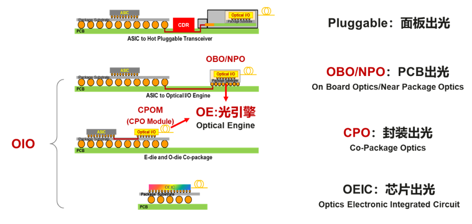 光電產(chǎn)業(yè)的最新發(fā)展提供了潛力解決這個(gè)棘手的問(wèn)題,那就是引入新興的OIO技術(shù)。OIO即Optical Input & Output,是通過(guò)大帶寬、高密光接口解決交換機(jī)芯片、CPU、GPU等大容量芯片的I/O端口散出的一系列技術(shù)。 具體產(chǎn)品形態(tài)有可能包括OBO(On Board Optics)、NPO(Near Package Optics)、CPO(Co-Package Optics)及未來(lái)可能部署的OEIC(Optics Electronic Integrated Circuit)。相對(duì)于當(dāng)前成熟的EIO技術(shù),OIO有望提供百倍以上的通道密度,每個(gè)通道可以提供百倍以上的帶寬,很可能成為交換芯片向100T、200T乃至更高容量演進(jìn)的必要技術(shù)。