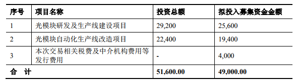 具體來(lái)看,新項(xiàng)目包括2項(xiàng),一是光模塊研發(fā)及生產(chǎn)線建設(shè),投資總額達(dá)2.92億元,擬投入募集資金為2.56億元;二是光模塊自動(dòng)化生產(chǎn)線改造,總投資2.24億元,擬投入募集資金1.94億元。