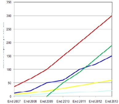 圖1: 移動回傳(MBH)容量需求. 資料來源: Heavy Reading Ethernet Backhaul Quarterly Market Tracker August 2010