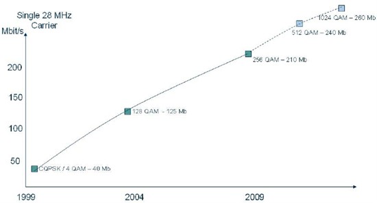 2009年以前,由于調(diào)制方式由4QAM提高到256QAM,其對應(yīng)的28MHZ帶寬的傳輸容量增長了5倍之多。目前微波調(diào)制方式已經(jīng)提高到了512QAM,到2012年,
