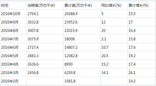 2016年1-10月我國光纜產(chǎn)量數(shù)據(jù)統(tǒng)計