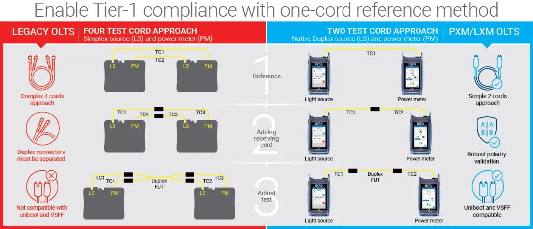 在測試設(shè)置中每增加一條線纜或一個適配器,就可能引入出錯的風(fēng)險。多余的連接會影響測試結(jié)果,導(dǎo)致測量不準(zhǔn)確。采用一跳線參考法,可減少連接數(shù)量,這意味著結(jié)果更加一致,錯誤也更少。