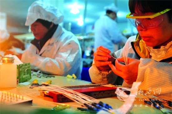 3月9日,保靖縣新中合光電科技公司生產(chǎn)車間,工人在加工電信、移動、聯(lián)通“三網(wǎng)合一”光電器件。新年以來,該公司產(chǎn)銷兩旺,全員滿負荷運轉(zhuǎn),生產(chǎn)訂單產(chǎn)品。