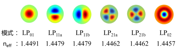光子燈籠的實現(xiàn)是基于少模光纖的模式復用技術,以少模光纖中幾個相互獨立的正交模式作為獨立的信道來成倍的提升光纖的通信容量,少模光纖不同模式傳遞信息如圖1所示。此外,少模光纖與單模光纖相比,模場面積更大,因此非線性效應的容限也會相對提高。這樣既提高了傳輸容量,又提高了香農(nóng)極限,從而極大的提升了整個光纖通信系統(tǒng)的通信容量。