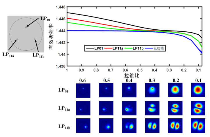 以拉錐型三模選模光子燈籠為例闡述模式復用技術:三模選模光子燈籠將三根單模光纖緊密對稱的分布在折射率略低于光纖包層的玻璃套管里,然后對整個套管進行拉錐處理,拉錐過程中單模光纖纖芯直徑逐漸減小,以至于激光大部分從纖芯泄漏到包層,纖芯與原有包層成為無效波導結(jié)構(gòu)。同時,每根光纖的原有包層也和鄰近光纖的原有包層進行熔合,逐漸形成新的導光纖芯,外層玻璃套管在拉錐的過程中變?yōu)樾碌陌鼘?,整體結(jié)構(gòu)形成新的纖芯/包層波導。光子燈籠的拉錐末端同少模光纖相連接,實現(xiàn)了多個基模向高階模的轉(zhuǎn)換,達到模式復用的效果。三模選模光子燈籠的有效折射率及模式演變?nèi)鐖D2所示。