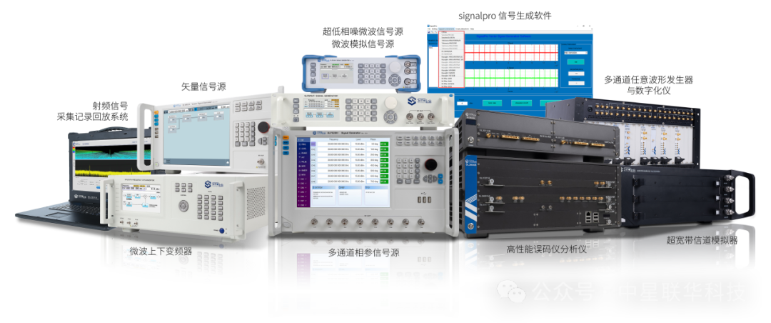 超低相噪微波信號(hào)源、高性能誤碼率測(cè)試儀、多通道相參信號(hào)源、超寬帶信道模擬器、射頻信號(hào)采集記錄回放儀等。