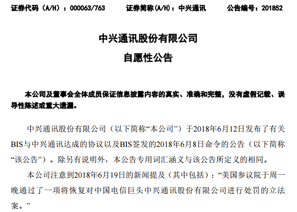 針對這個消息,中興通訊在6月20日發(fā)布自愿性公告,就2018年6月19日有新聞報道提及(其中包括)的:“美國參議院于周一晚通過了一項將恢復對中國電信巨頭中興通訊股份有限公司進行處罰的立法案。”消息進行澄清。