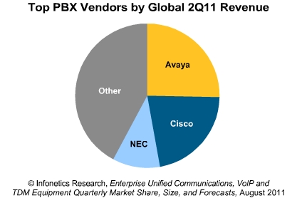 “隨著企業(yè)轉(zhuǎn)向IP和統(tǒng)一通信解決方案,頂尖的企業(yè)電話供應(yīng)商仍然在緊張的戰(zhàn)斗中以獲取新的客戶、守住現(xiàn)有客戶。連續(xù)三個季度,Avaya一直領(lǐng)跑于整個PBX市場,其中憑借穩(wěn)定的出貨量以及健康的平均售出價格,11年二季度占據(jù)全球PBX銷售收入的四分之一。Cisco有力的保持著第二位盡管在整個電線出貨量稍稍領(lǐng)先。”Infonetics VOIP以及IMS專業(yè)分析師Diane Myers指出。