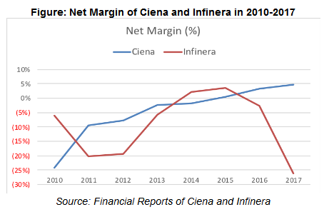 Ciena在創(chuàng)新方面的領導力對公司的成功至關重要。在100G、200G和更近期的400G DWDM方面,Ciena的產品上市時間早,這幫助該公司提高了2016-2017年的盈利能力。相比之下,Infinera由于遲遲沒有推出200G和400G(每波長)產品,公司盈利能力在過去兩年內急劇下滑(如下圖)。