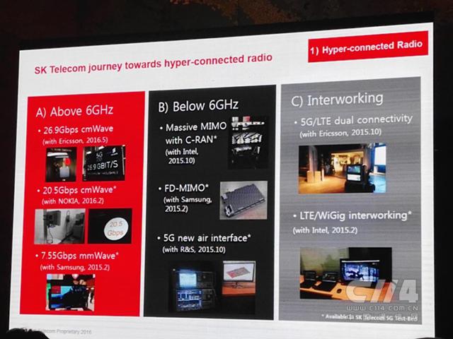 SK電訊在6GHz以上頻段分別與愛(ài)立信(29.6Gbps cmWave)、諾基亞(20.5Gbps cmWave)和三星(7.55Gbps mmWave)進(jìn)行了合作;在6GHz以下頻段則與英特爾進(jìn)行了Massive MIMO with C-RAN的合作,與三星進(jìn)行了FD-MIMO的合作,與R&S就5G新空口技術(shù)進(jìn)行了合作;同時(shí),SK電訊與愛(ài)立信在5G/LTE雙重連接方面進(jìn)行了合作;與英特爾在LTE/WiGig交互方面進(jìn)行了合作?! ?/p>