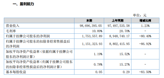 ICCSZ迅 近日,瑞谷光網(wǎng)發(fā)布2017年上半年業(yè)績報告: 2017年1月1日至6月30日報告期間,公司營業(yè)收入為9869.64萬元,較上年同期增長1.23%;歸屬于掛牌公司股東的凈利潤為175.36萬元,較上年同期下滑80.4%;基本每股收益為0.05元,上年同期為0.29元。